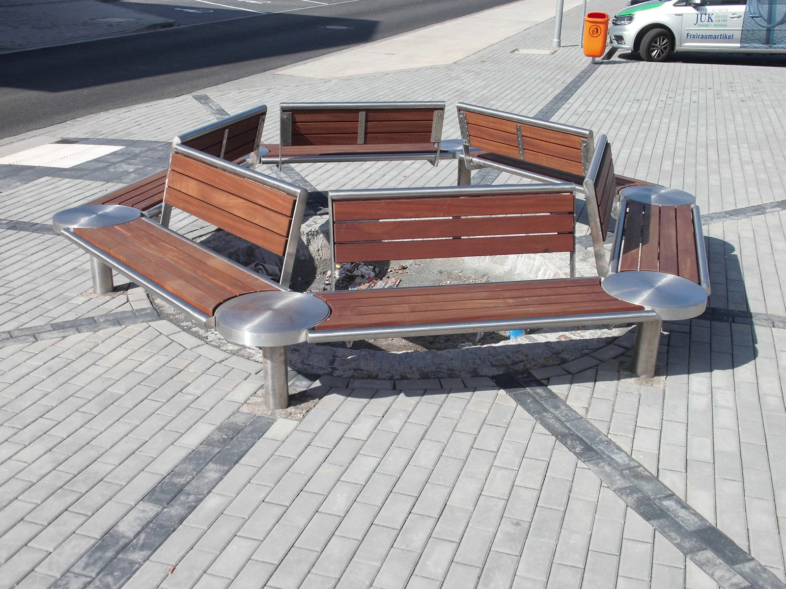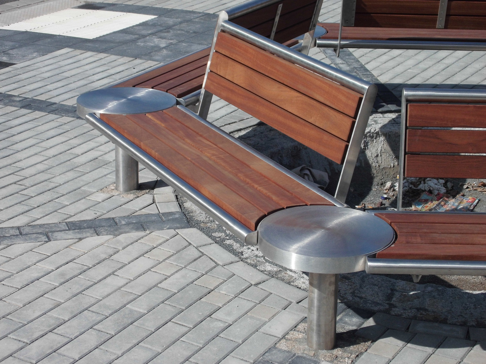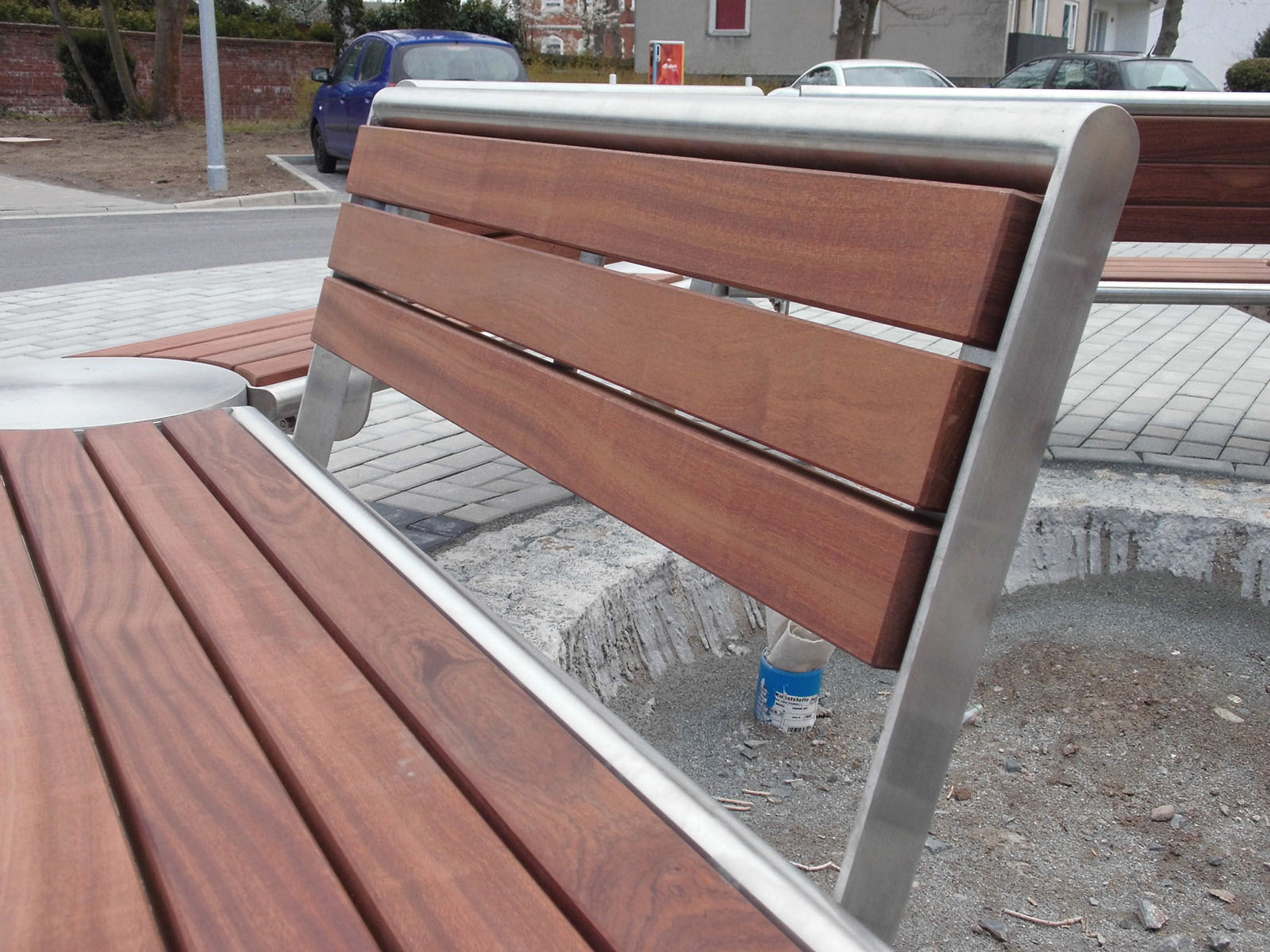 mit Rückenlehne, ohne Armlehnen, Sitz- und Rückenlehne Holz, Stahlunterkonstruktion Edelstahl geschliffen oder Stahlunterkonstruktion feuerverzinkt, inklusive farbliche Oberflächenbehandlung der Stahlkonstruktion