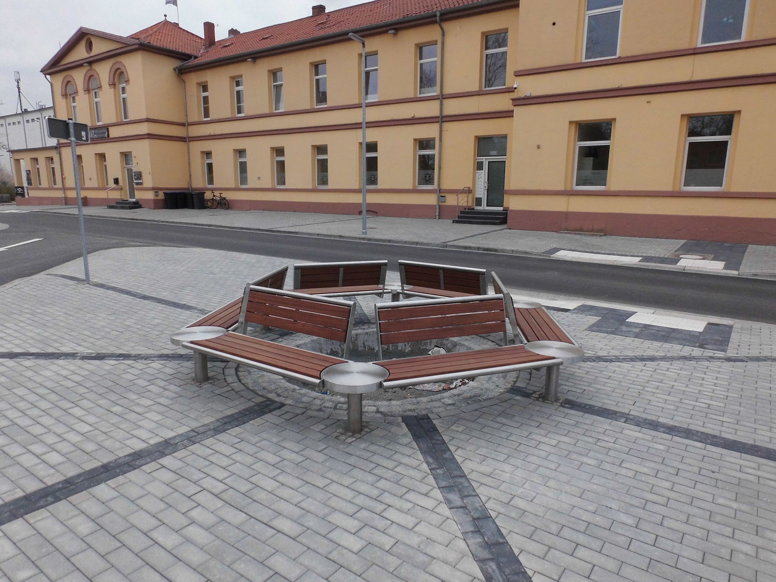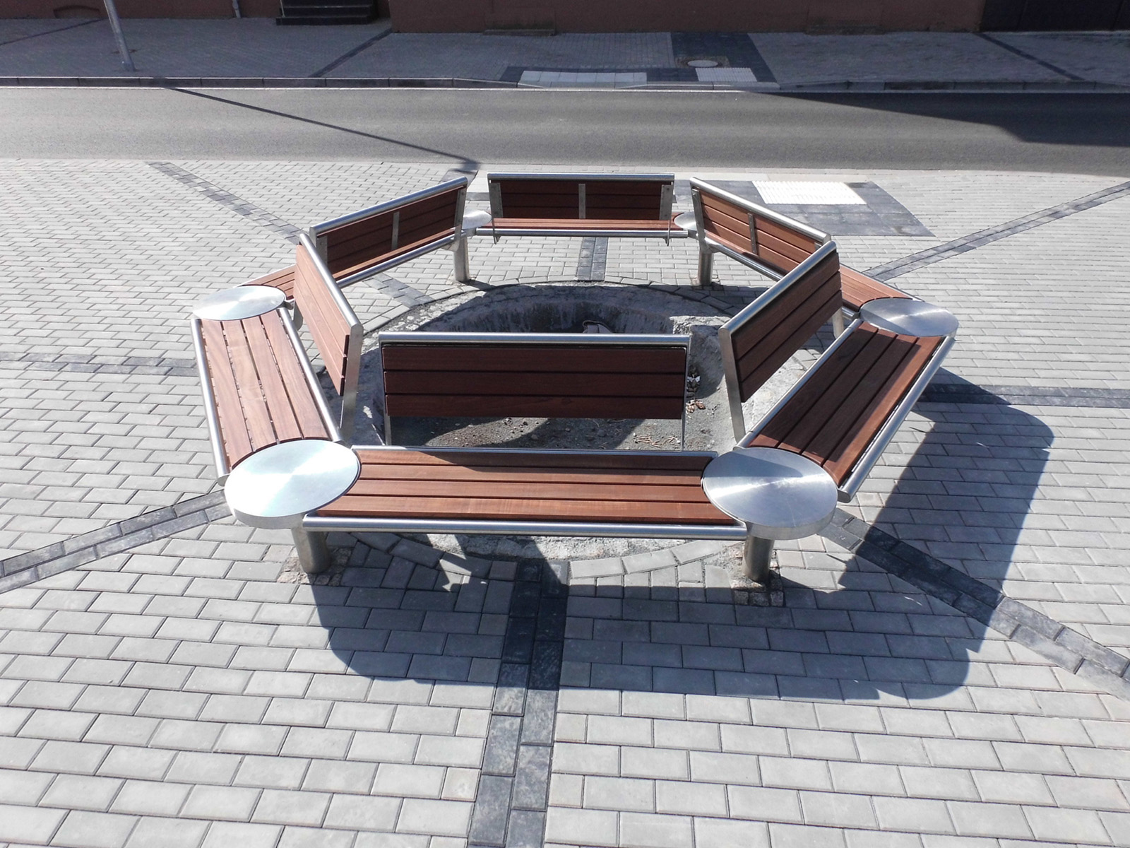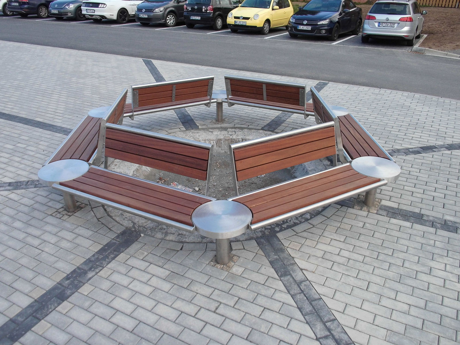 mit Rückenlehne, ohne Armlehnen, Sitz- und Rückenlehne Holz, Stahlunterkonstruktion Edelstahl geschliffen oder Stahlunterkonstruktion feuerverzinkt, inklusive farbliche Oberflächenbehandlung der Stahlkonstruktion