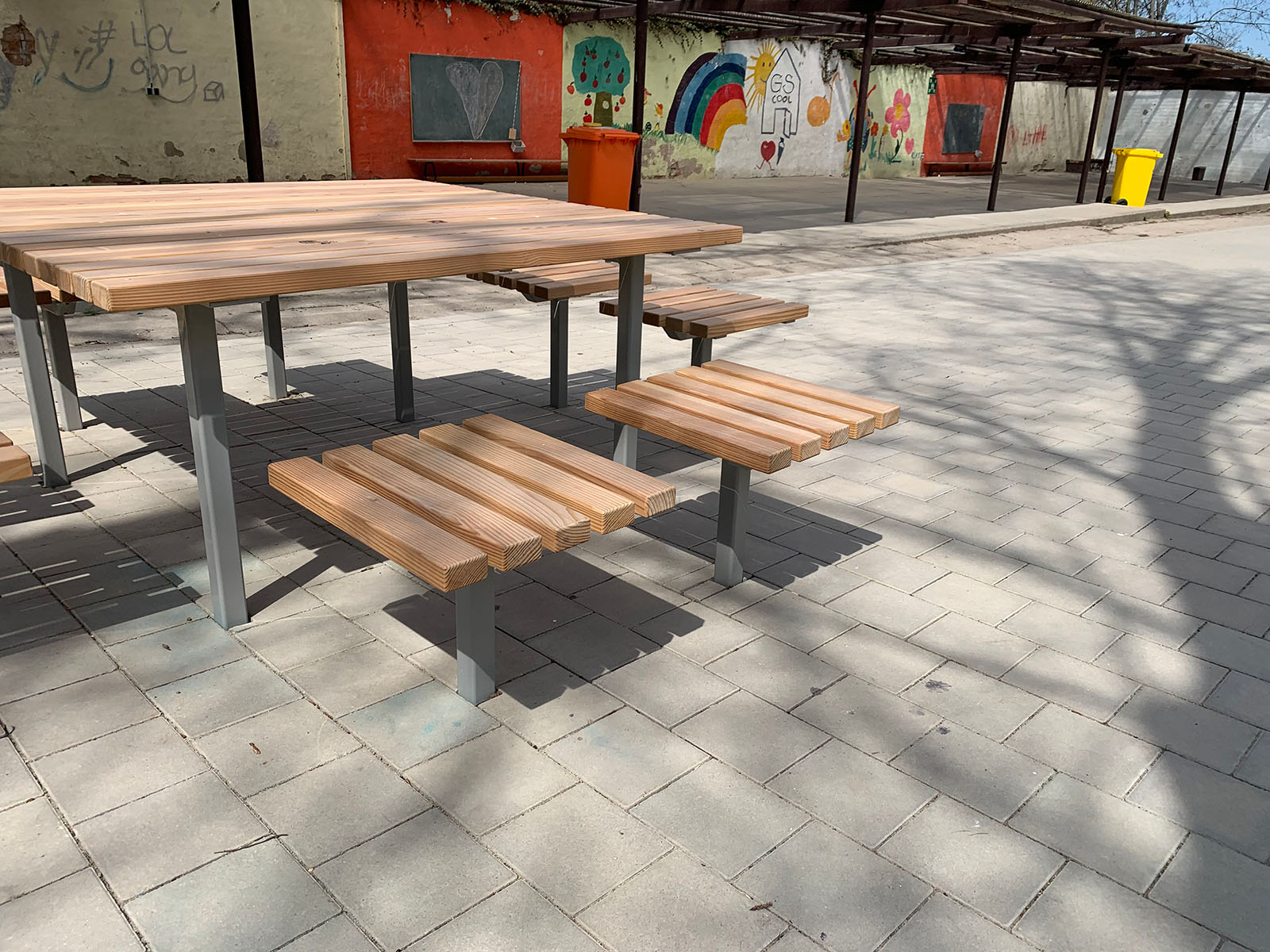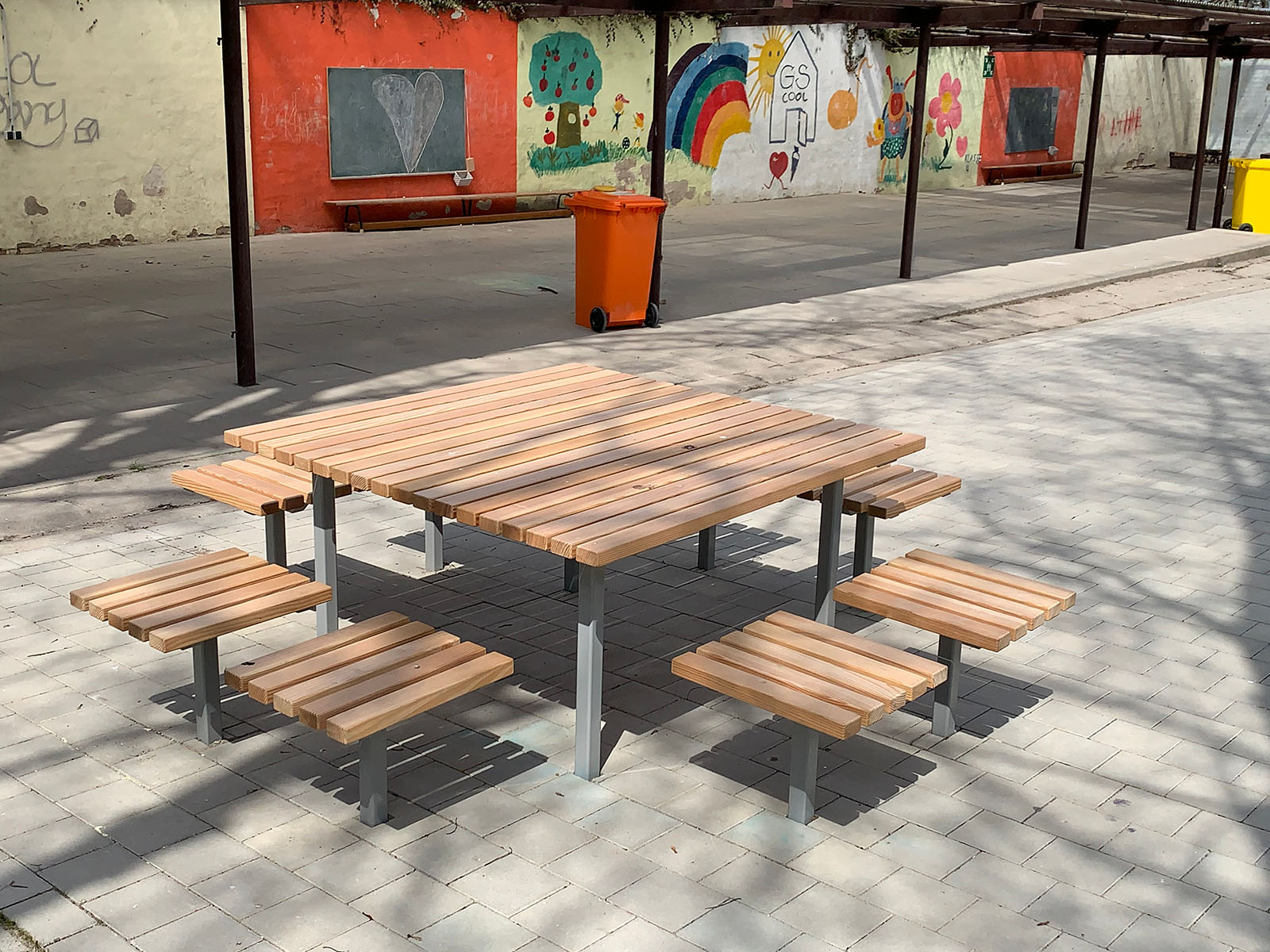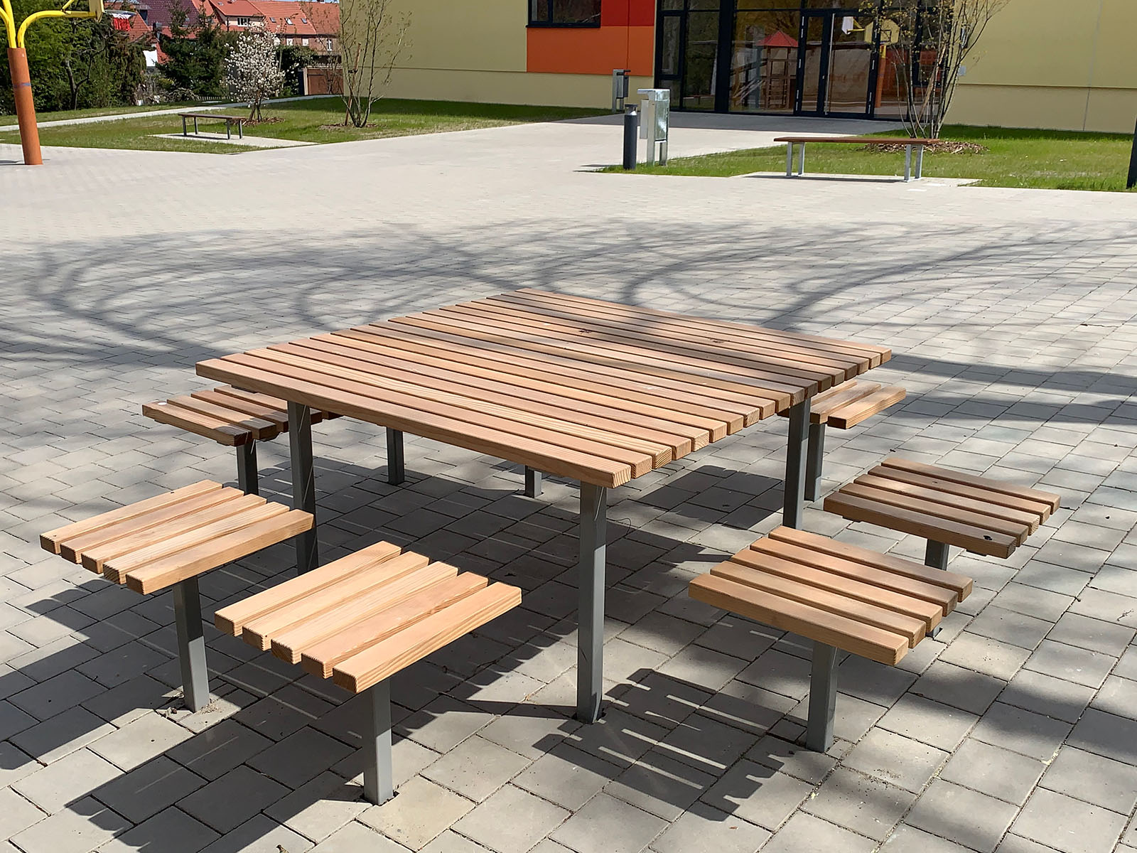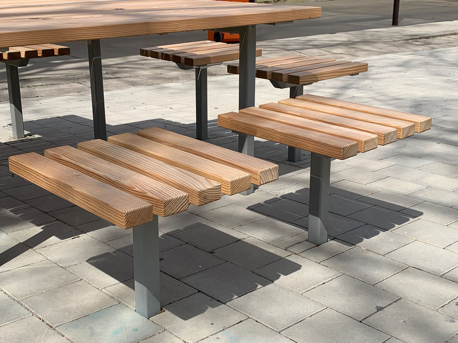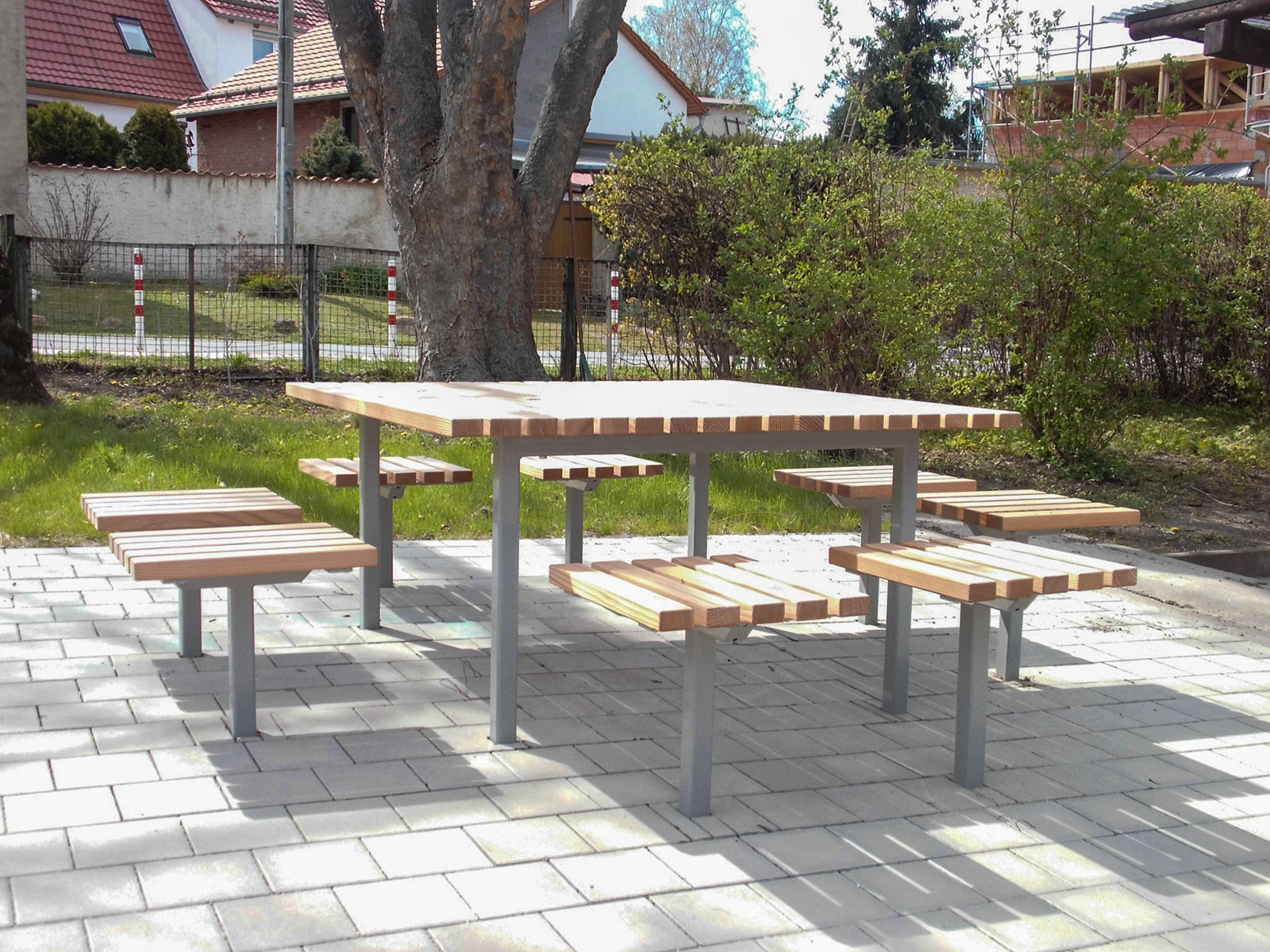Einzelhocker mit Tisch, Profilrohrunterkonstruktion, Sitz- und Tischfläche aus Holz, zum freien Aufstellen, zum Aufdübeln oder zum Einbetonieren, Stahlunterkonstruktion feuerverzinkt, inklusive farbliche Oberflächenbehandlung der Stahlkonstruktion